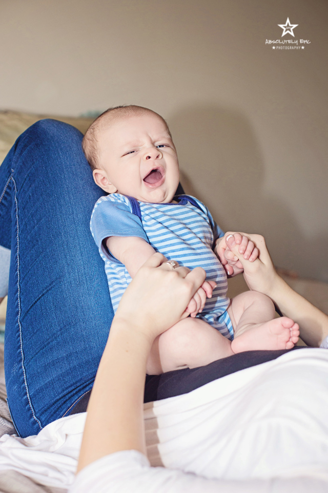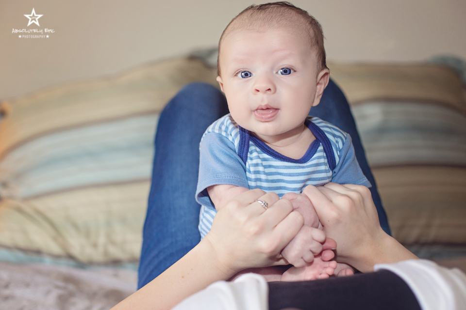 I just absolutely love shooting Life Style Newborn Sessions! I know I have said it before…but that is how much I love them. They show so much emotion. You get to see all their first little grins and fat cheeks. And don’t get me started on their cute little feet and their mothers kissing on them! I love the bond you get to be a witness to between mother and baby in Life Style Sessions. Daddy would be in the photos but he is away serving Our Country. This little guy is going to have so much love surrounding him! He was amazing thru the whole shoot. Just as happy as a little guy can be! The smiles he gave me just melted our hearts! He had and audience for his session. Everyone was tip toeing and giggling at him. Greyson was so proud of himself! I seriously could hardly wait to edit his session…it was hard to wait till his session came up on the editing list. Those blue eyes and smiles are going to wrap everyone around his little finger at first sight. We did a few posed photos but he didn’t seem to mind that a bit! In fact he shined and made us all smile even more! Introducing Mr. Greyson!!!